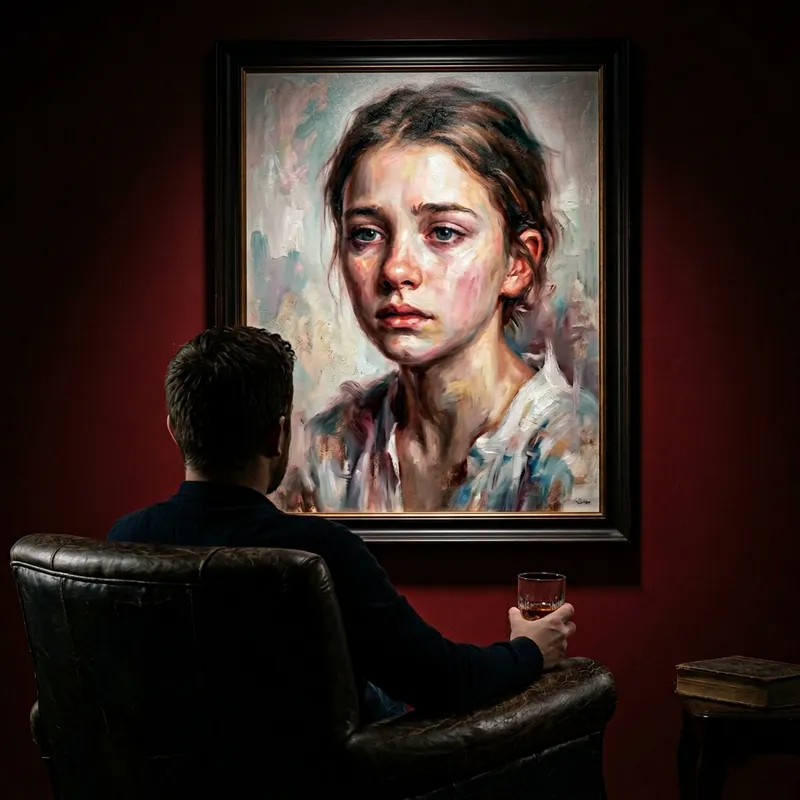 Use the attached image as a reference for the girl’s face and appearance, creating a scene where a man sits in a leather chair with his back to the viewer in his home, looking at a large oil portrait on the wall, holding a glass of whiskey. The painting should depict the same girl in a realistic expressive oil painting style, showing her face and upper body with textured brushstrokes and soft colors. The wall of the house is clean and red with a soft reflector illuminating the artwork, creating a professional exhibition atmosphere. The room is dark with an exhibition ambiance.