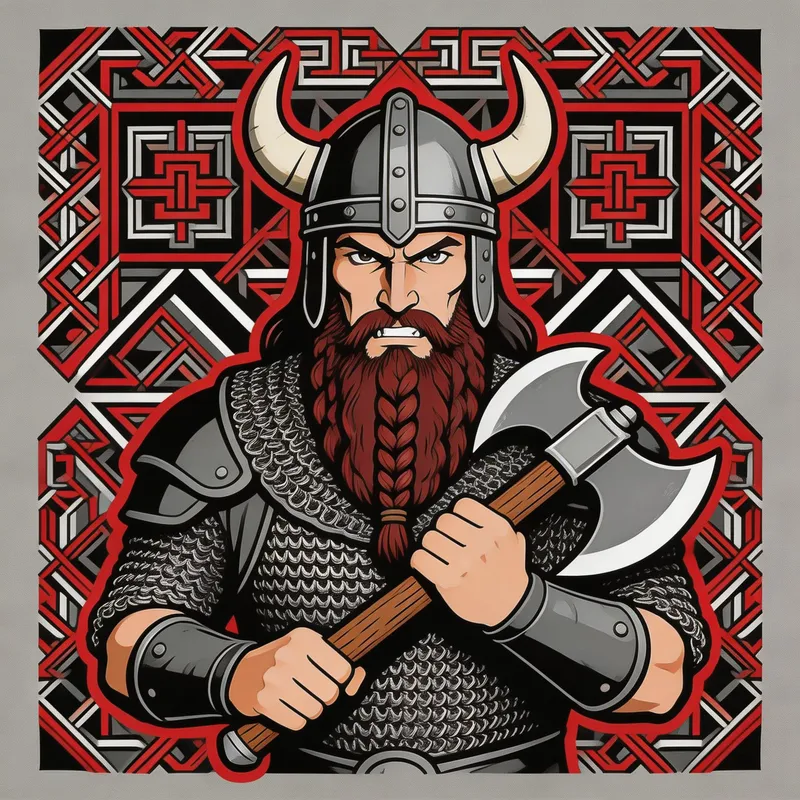You are an art designer. You need to come up with a print for a sports t-shirt featuring a Viking image. The background of the print has patterns from ancient Russia. Geometry.