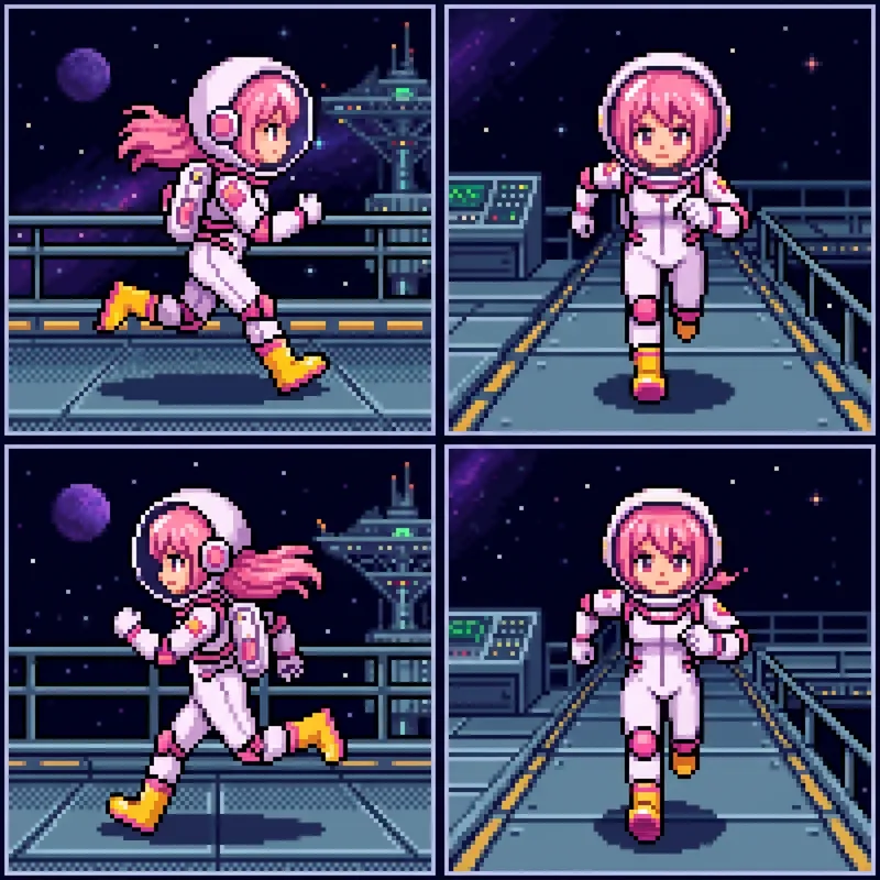 Please create 4 images of a pink-haired girl in a spacesuit in a pixel art style, showing running motions from the front and side views.