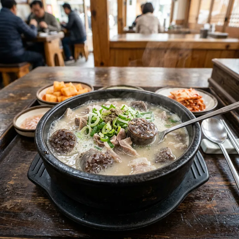 Sundae soup image, with plump sausages and milky bone broth, served in a black bowl with a small amount of green onion topping.