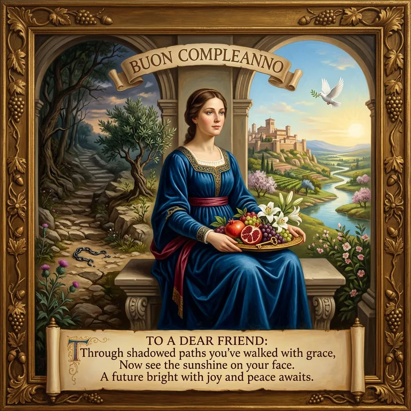 Create a birthday card to congratulate a friend. It should reflect their difficult path and bright future ahead, filled with symbolism in the style of Renaissance paintings.