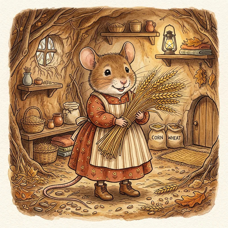 Mouse from the Thumbelina fairy tale in a dress, holding wheat in a drawing style.