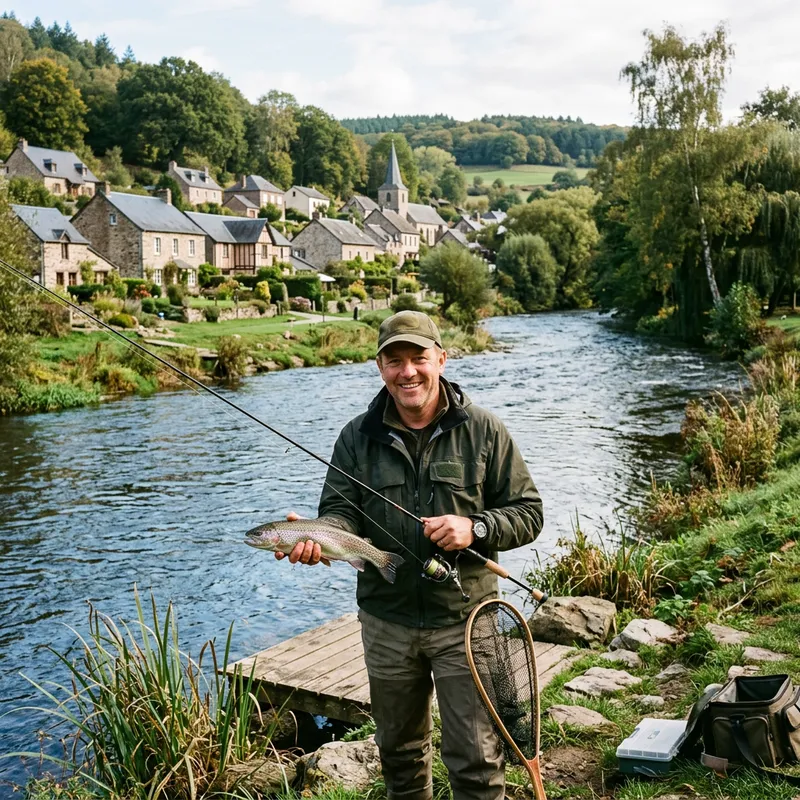 Make a river, behind it a village, houses, trees, and I am standing in front with a fishing rod and fish.