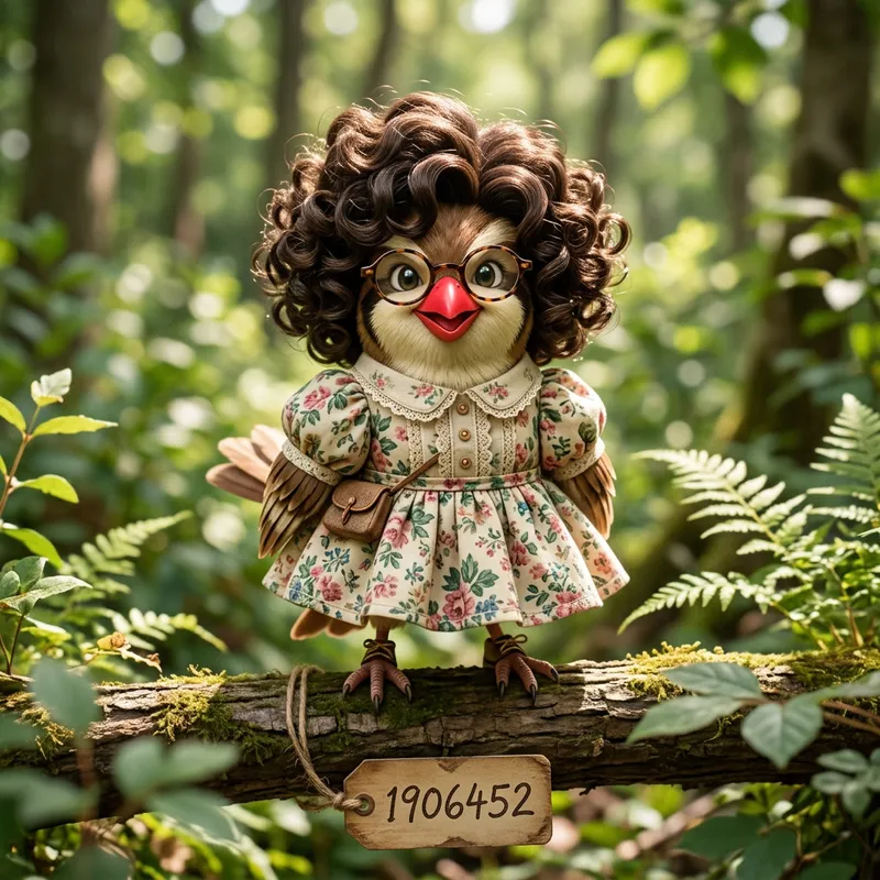 Original Prompt: 赤色 鳥のくちばしメガネをかけている もじゃもじゃのパーマの髪の毛 ドレスを着ているポケモン