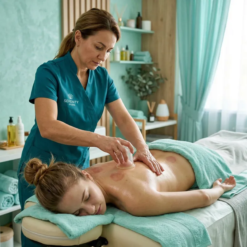 Create an image of a masseur performing a motion using special vacuum cups on a girl's back. The interior of the studio is in mint-teal tones, highly photogenic with clearly drawn hands and face, 8K.