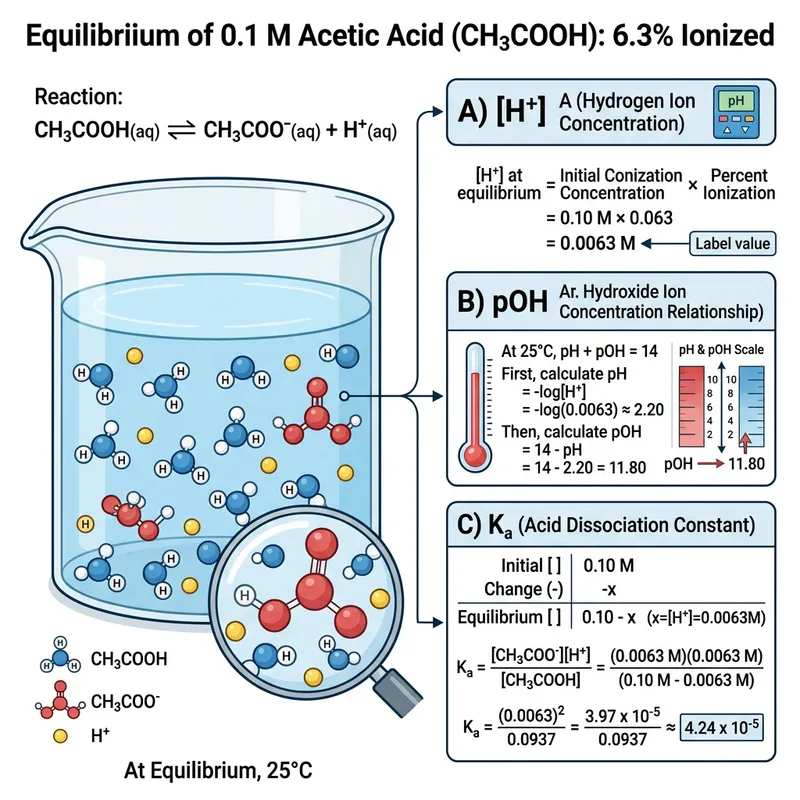 A detailed depiction of a 0.1M solution of acetic acid (CH3CooH) showing it to be 6.3% ionized at equilibrium. The image should visually represent the concepts of A) [H+], B) pOH, and C) Ka.