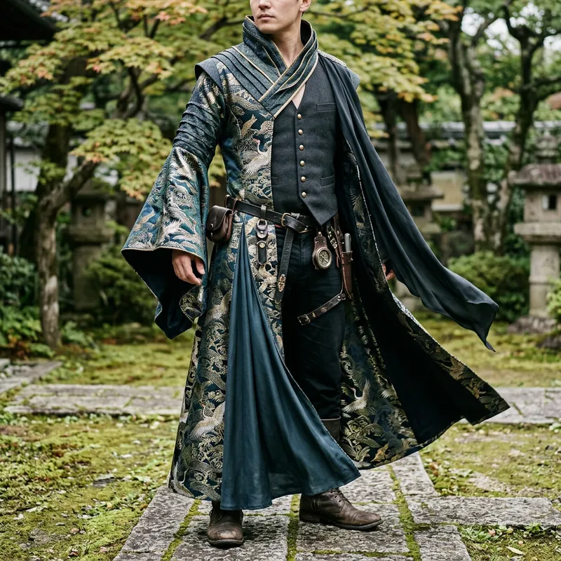1. Front Panels (Asymmetrical): Left Front: A long, full panel with a wide, bell-shaped sleeve. The sleeve and upper body have a layered or textured appearance, while the lower part is smooth and flowing. This panel includes half of the standing collar. Right Front: Primarily consists of a fitted, dark vest visible underneath. The outer jacket on this side is minimal, but a long, dark, flowing fabric piece drapes from the right shoulder. 2. Back Panel: A single, very long and wide piece that extends to the ankles, designed for a flowing, dramatic drape. It will be wider at the bottom than the top. This piece will attach to the front left panel and integrate the flowing fabric from the right shoulder area. 3. Collar: A high, standing collar with multiple layers or folds, creating an ornate look. It has a V-shaped opening at the front. 4. Inner Vest (Separate Piece): A fitted, dark vest with buttons down the front, designed to be worn underneath the open jacket. 5. Waist Details: A main belt around the vest, plus various decorative straps, buckles, and small pouches that attach to the belt or jacket. Key Construction Notes: Fabric: Consider a fabric with good drape for the flowing parts and a slightly stiffer fabric for the collar and structured left shoulder. Layering: The left shoulder has distinct layered details. Embroidery/Pattern: The intricate patterns on the left sleeve and back panel should be considered for fabric choice or surface embellishment.