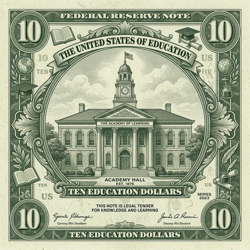 Create an image of a school that is stylized to look like it's part of a 10 dollar bill. The school should be depicted in a fine, engraved style typically seen on currency, with intricate details and a monochromatic green hue. The building should be symmetrical, featuring traditional architectural elements such as columns and a large front entrance. Around the edges of the bill, replace the usual financial motifs with educational symbols like books, globes, and graduation caps.