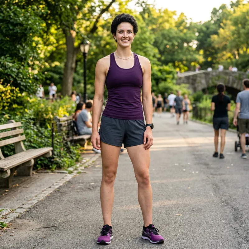 16 year old, white female, with short cut black curly hair and bright blue eyes. She's smiling. She has a muscular trim build and is 6ft 2in tall. She likes the color purple. She looks like a young Lynda Carter