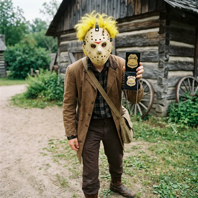 A 17-year-old Caucasian teenager wearing a historical pioneer uniform and holding an attorney badge. He dons a hockey mask on his face, and his hair is wild, spiky, and dyed a vivid yellow.