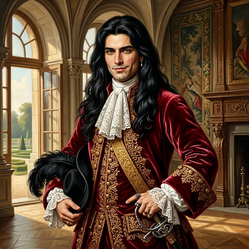 A 17th century South European nobleman, possibly of French descent. He flaunts an impressive curtain of dark black hair that falls long and unrestrained. His face is clean-shaven, free from any whiskers. Adding an edge to his handsome features are two distinctive scars on his left side which, oddly, only seem to enhance his attraction. His mouth is often curled into a sarcastic smirk, giving him an air of effortless charm. He is garbed in a suit made of luxurious deep red velvet, resembling a crimson river under the sunlight.