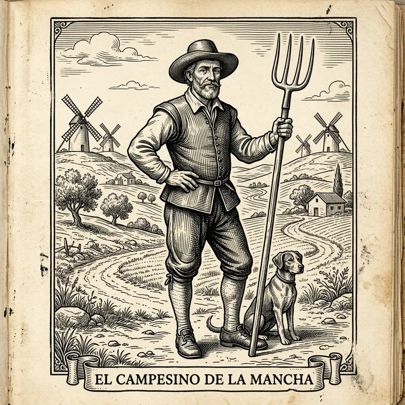 Create an image in the style of a drawing from the early 17th century, featuring a posing farmer. The aesthetic should be inspired by the illustrations associated with Don Quixote literature, with an emphasis on detailed black and white line work, rustic clothing, and a countryside background.