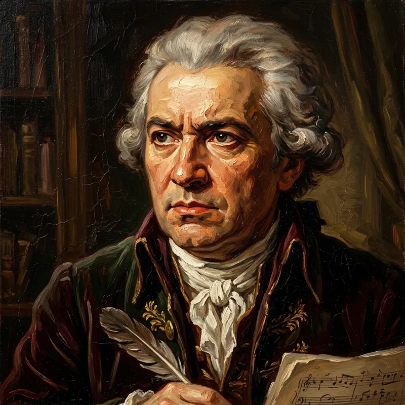 Create an oil painting of an esteemed composer from the 18th century. Bring focus to a meticulously attended depiction of their face, to capture the intensity and passion for music that they had. Each brushstroke should reveal an intricate play of light and shadow on the face, highlighting profound emotions. The image, painted in rich colors and magnificent details, would allow viewers to immerse themselves in the world of a musical genius and remind them of the power and depth of their compositions.