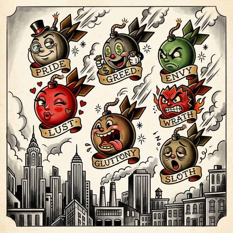 Generate an image of a traditional tattoo design inspired by the style typical of the 1940s, showcasing the concept of the seven deadly sins. The sins are individually represented as caricature bombs with expressive faces, each embodying one of the seven sins: pride, greed, lust, envy, gluttony, wrath, and sloth. These symbolic bombs are falling down towards an intricately detailed cityscape. The city is represented in a grayscale coloring to contrast with the rich, vivid colors of the bombs. The overall illustration should reflect the bold lines, often strikingly colorful, and frequent use of symbolism found in early 20th-century tattoo art.