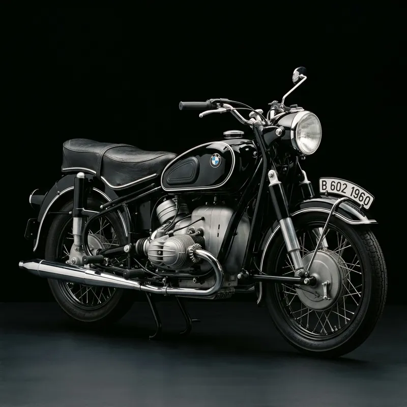 A meticulously detailed 1960 BMW R60/2 motorcycle, showcasing its classic features and vintage styling. The motorcycle is the centerpiece of the image, bathed in soft light that accentuates its curvaceous design and lustrous mechanical components. Its main body and tires are in black which contrasts vividly against the pitch-black background. Elements such as its dynamic lines, round headlights, finely designed exhaust system, and well-preserved leather seating, all contribute to an image that is both nostalgic and captivating.