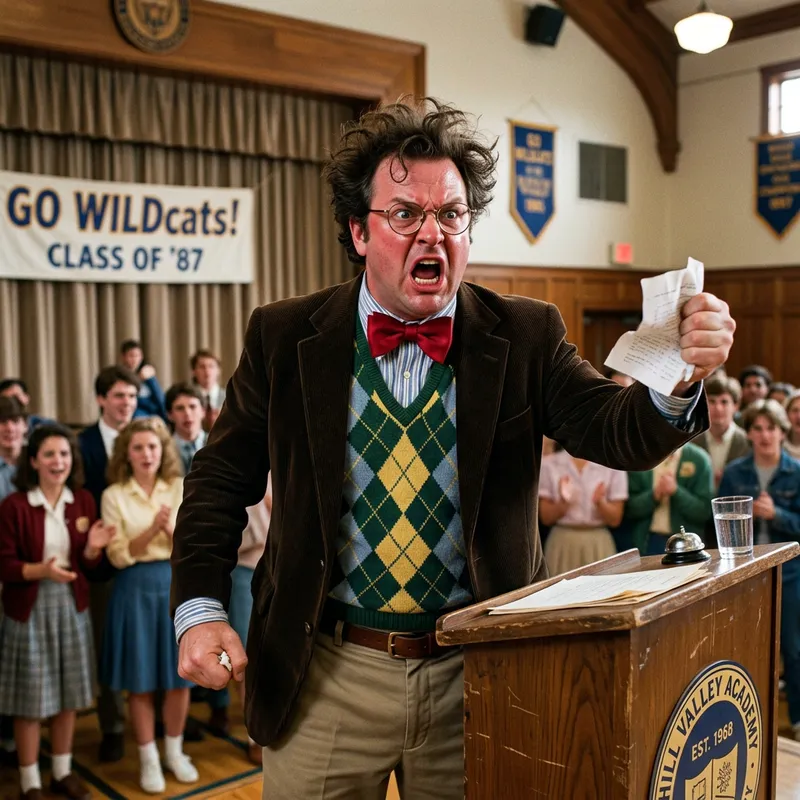 An angry character similar to a comedic antagonist from a popular 80s kid's movie. He's a grown man, dressed in an over-the-top preppy outfit with a prominent red bow tie. His dark, curly hair is slightly disheveled and he has an exaggerated angry expression on his round face.