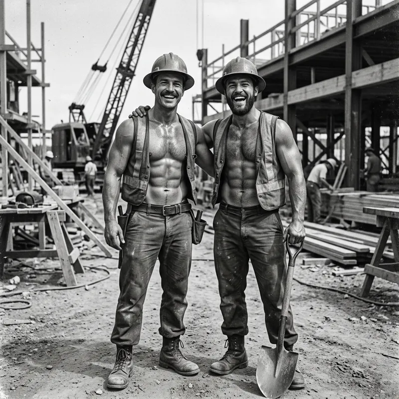 2 smiling men shirtless with hard hats and vests.