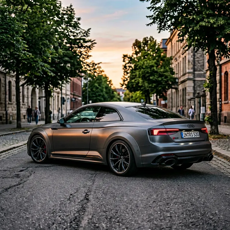 A wide body 2020 Audi RS5 in a striking gunmetal grey colour. The car is sitting on a quiet city street lined with trees, in the soft glow of the setting sun. The Audi has a dynamic, streamlined design with flared wheel arches, and the distinctive honeycomb grille announcing its sporty pedigree. The LED headlights present an intense look, while the pronounced rear diffuser and oval exhaust tips suggest raw power waiting to be unleashed. The Metal grey finish gives it a sleek, understated appeal, perfect for the car enthusiast who prefers subtlety over flash.