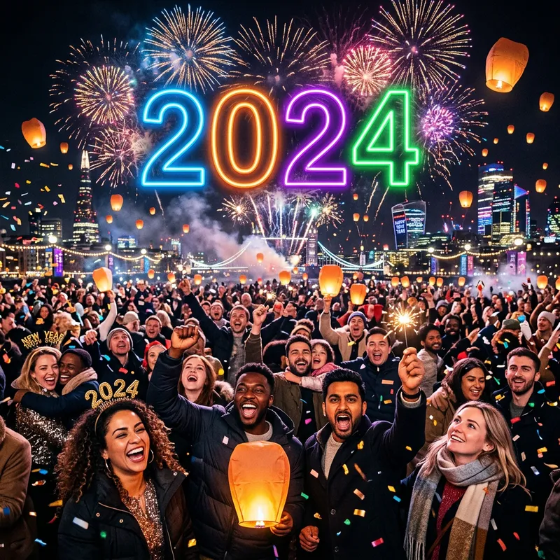 Create an image portraying the celebration of the upcoming 2024 New Year. Center the scene on a large, digitized '2024' glowing with bright, neon colors against the dark night sky. Include a crowd of excited people from varied descents such as Caucasian, Hispanic, Black, Middle-Eastern, South Asian, and White, both men and women celebrating, shouting in joy, sending sky lanterns, and popping confetti. Everyone wearing festive attire, sharing warmth and happiness. In the background, depict a vibrant cityscape with high-rise buildings, festooned with lights, and the sky bursting with colorful fireworks.
