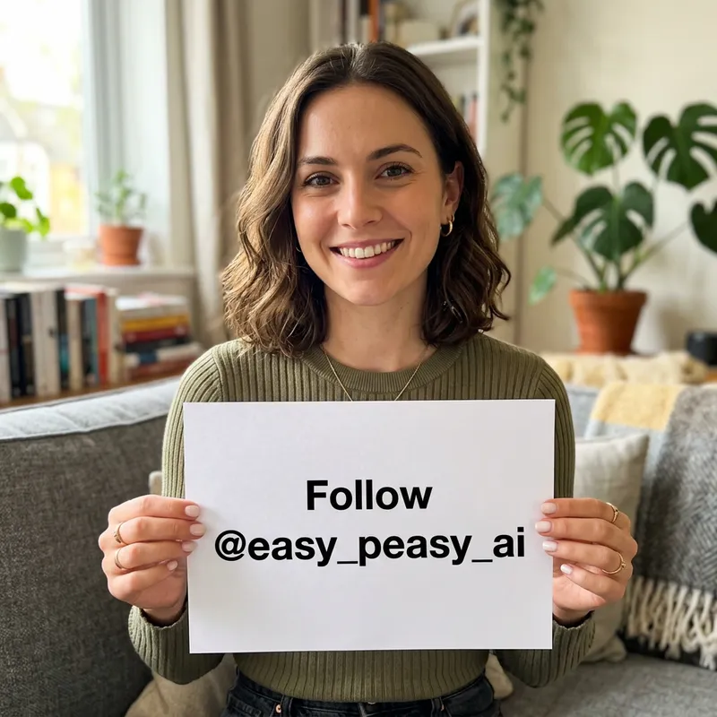 25 year old beautiful woman holds A4 paper with text “Follow @easy_peasy_ai”, iPhone shot, handheld, uploaded to Instagram