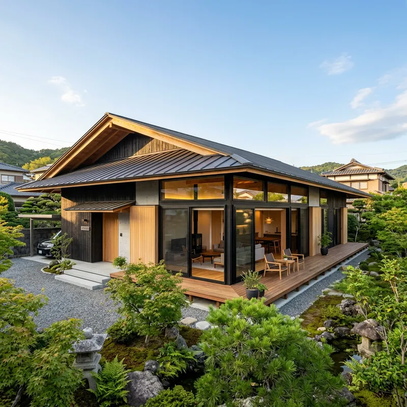 House, single-story, with a long eaves, large windows for light, luxurious design, 28 tsubo.