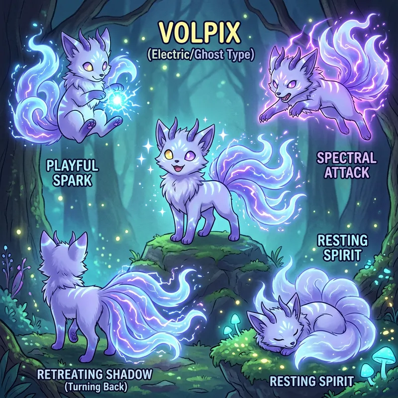 Create a 2D illustration of a fictional creature similar to an electric and ghost type Vulpix in a variety of poses, including one where it is turning its back.