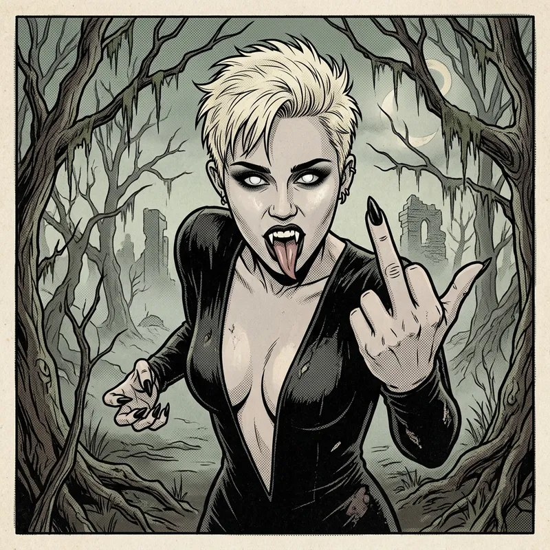 2d fine halftone comic style, muted Pantone colors, a goth vampire woman resembling Miley Cyrus, short blonde spiked hair, dark ere makeup and 2d fine halftone comic style, muted Pantone colors, a goth vampire woman resembling Carrie Underwood, short blonde spiked hair, dark eye makeup and pale skin, long vampire teeth and long forked tongue, big white eyes, tight long sleeve vampire dress, neckline plunges from neck to navel, looking straight ahead a the viewer in attack pose with her clawed hands reaching out for the viewer , In a ghost forest, high-detail pale skin, long vampire teeth and long forked tongue, big white eyes, tight long sleeve vampire dress, neckline plunges from neck to navel, looking straight ahead a the viewer her tight arm extended to the viewer giving the middle finger gesture to the viewer , In a ghost forest, high-detail, hand detail.