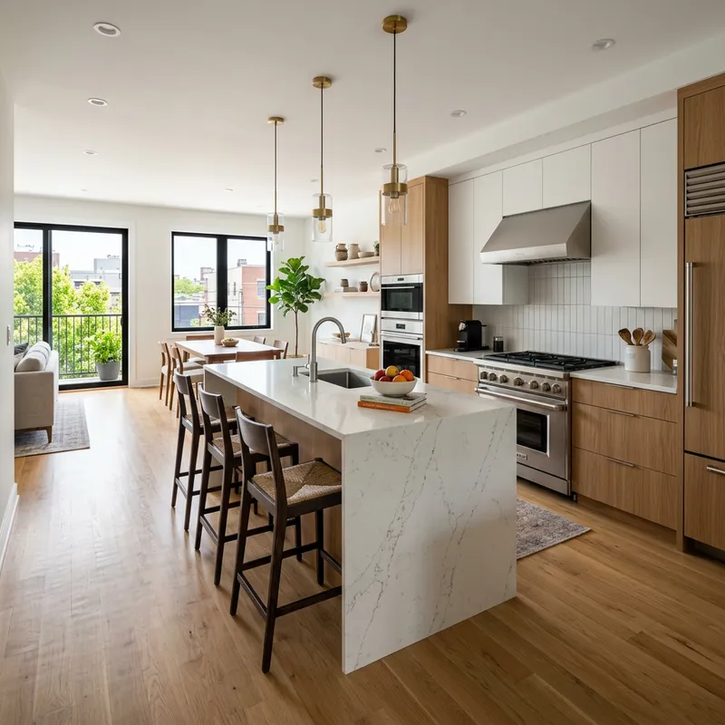 2nd floor open kitchen layout and design, featuring modern appliances, an island with bar stools, a spacious layout with natural light, contemporary cabinetry, and stylish decor, showcasing a harmonious blend of functionality and aesthetics.