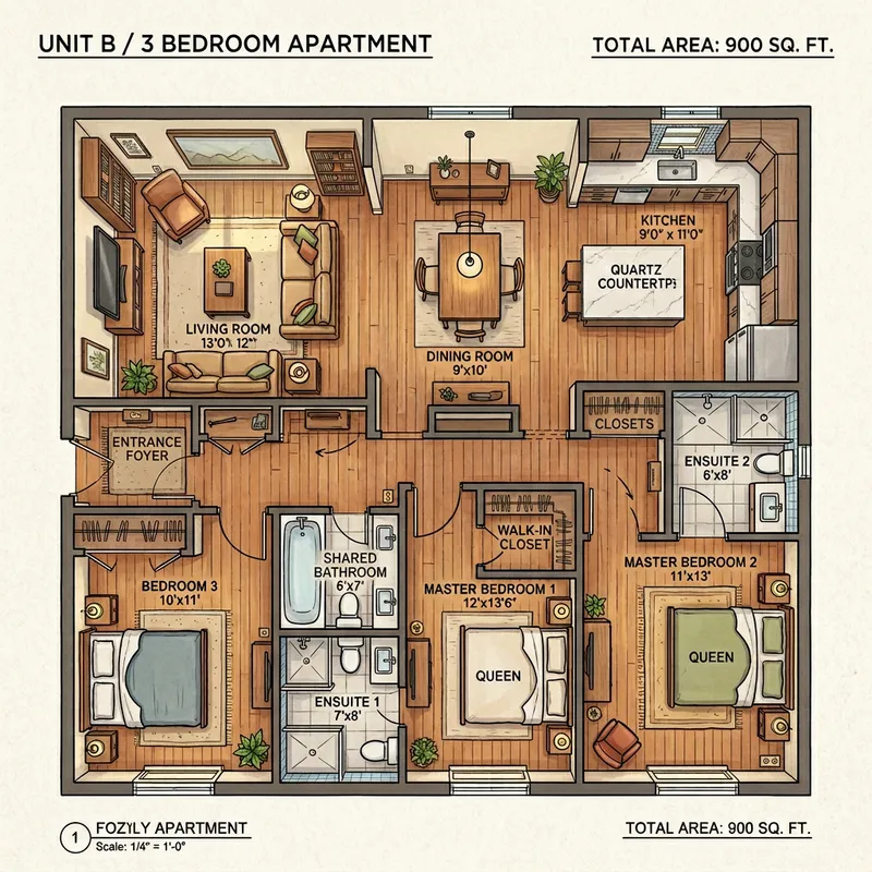 A 900 sqft, 3 bedroom apartment layout. The apartment includes two master bedrooms, each with its own ensuite bathroom, and there is an additional bathroom too. The communal areas include a kitchen, a separate dining room, and a living room, all furnished and decorated to create a warm, inviting atmosphere.
