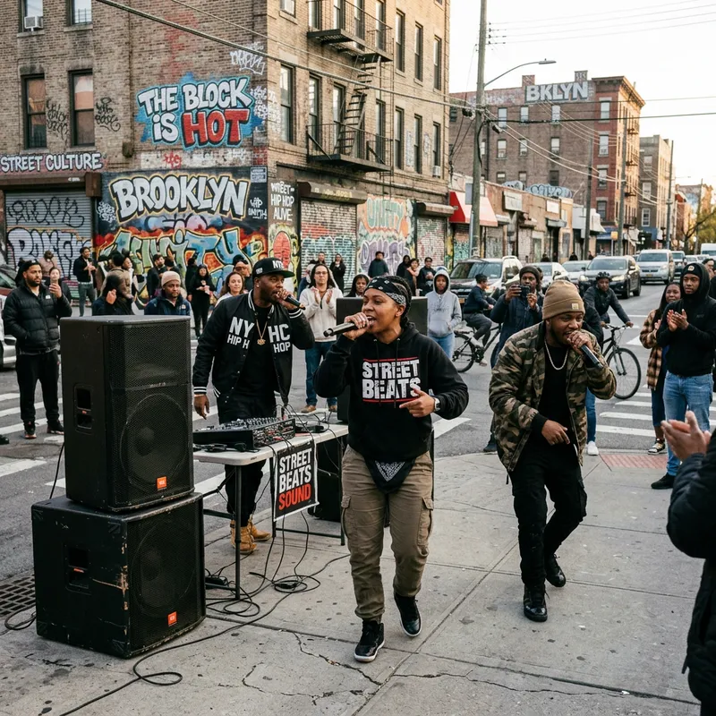 Original Prompt: 3 cantantes de rap en la calle con parlantes