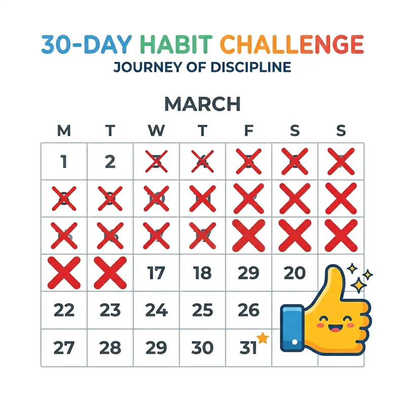 A digital illustration of a calendar, with the days being crossed off one by one. The calendar is on a solid white background, and it's obvious that it's marking days off as a form of challenge or accomplishment. Day by day, the X's show progress and build to a point of achievement. Alongside the calendar is a stylized thumbs-up emoji, symbolizing encouragement and perseverance. These symbols together suggest a journey of self-improvement and discipline.