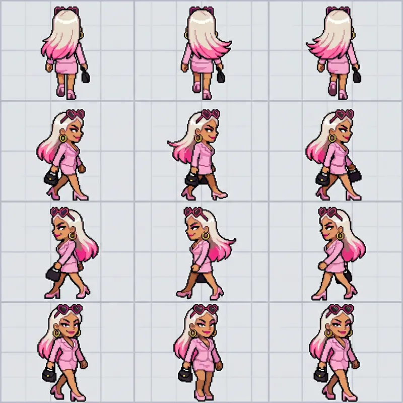 32x32 pixel art SPRITE sheet of a fashionable, dramatic Latina mean girl character named Petty A. F. Coates. She's inspired by 2000s Beverly Hills teens, Regina George, and telenovela villains. She wears a pastel pink designer mini skirt suit, chunky high heels, oversized gold hoop earrings, and heart-shaped sunglasses on her head. Long platinum blonde hair with pink tips. Holding a small purse. The sheet shows 12 RPG character walk cycle frames arranged in a 4x3 grid: Row 1: walking up (back view) Row 2: walking left (side view) Row 3: walking left (side view) Row 4: walking down (front view) Retro pixel style. Bright, expressive, classic RPG game aesthetic. Each frame is clean and colorful. No shadows or gradients.