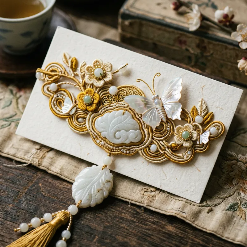 A type of Chinese-style jewelry with a Zen feeling, mysterious and vintage, featuring elements such as floral winding technique with silk threads around 350g cardstock; adorned with jade and butterfly shells; main colors are gold, white, and yellow.