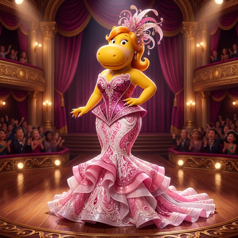 3d animation style full body image of tall curvy yellow skin hippo Tasha from Backyardigans posing elegantly on a stage.. full body image. She wears a spectacular, elegant and unique mermaid dress made of intricate and elegant colored . The color combination pink and pink withe. It has an exaggerated triangular cinched waist and matching long shiny nails. . she has an abstract headdress. the image is cinematic