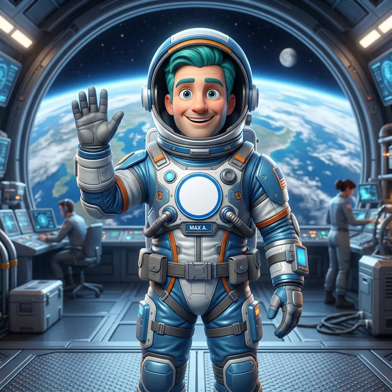 3D cartoon style mascot, middle-aged astronaut 35 years old, with a large head and big eyes, turquoise hair, dressed in a futuristic spacesuit, detailed textures, shiny surface, space theme, friendly and professional appearance, looking into camera and waving. Spacesuit in blue and white tones with empty space for a logo on the chest.