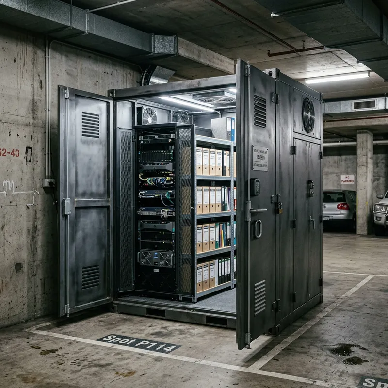 3D conceptual design of a large rectangular metal storage box for documents and servers. The box is placed in an underground parking. Dimensions are Height: 280cm, Width: 160cm, Length: 250cm. Features include multiple compartments with additional shelves for document storage and server racks. Ensure ventilation and security locking mechanisms. Show detailed interior with shelves and server racks. Industrial look with durable finish.