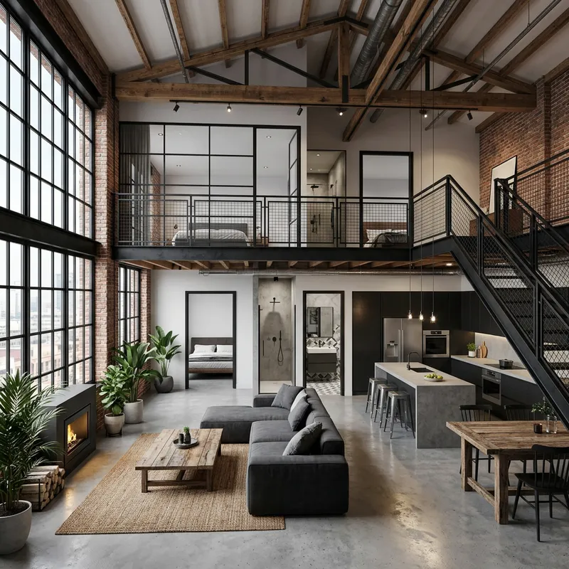 3D Design of a Modern 4-Bedroom Loft with Industrial Aesthetic