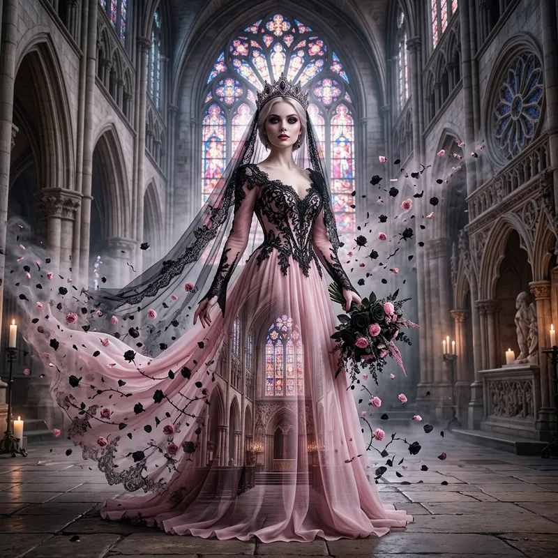 3D, doubleexposure, fantasy, gothic, breathtaking gothic bride, pale skin, dark eyeshadow, rose lipstick, flowing soft pink gown, black lace detail fitted bodice, long veil, gothic tiara, sleeves extending into pointed cuffs, blends into a cathedral with stained-glass windows, mist, pink-black tiny roses, swirls around, award-winning double exposure, unreal engine, hypersurrealism, ultra-detailed, photorealism.