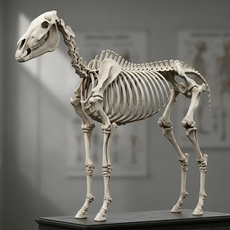 A complex and detailed representation of an equine skeletal system in 3D. The image will showcase the structure of the horse's bones in a dimensional perspective that provides depth, shadows, and highlights. The skeleton should be displayed in its entirety; from the horse's skull and jawbone, extending along the spine, encompassing the rib cage, and descending to the legs and hooves. It should offer a comprehensive understanding of the horse's anatomical framework.