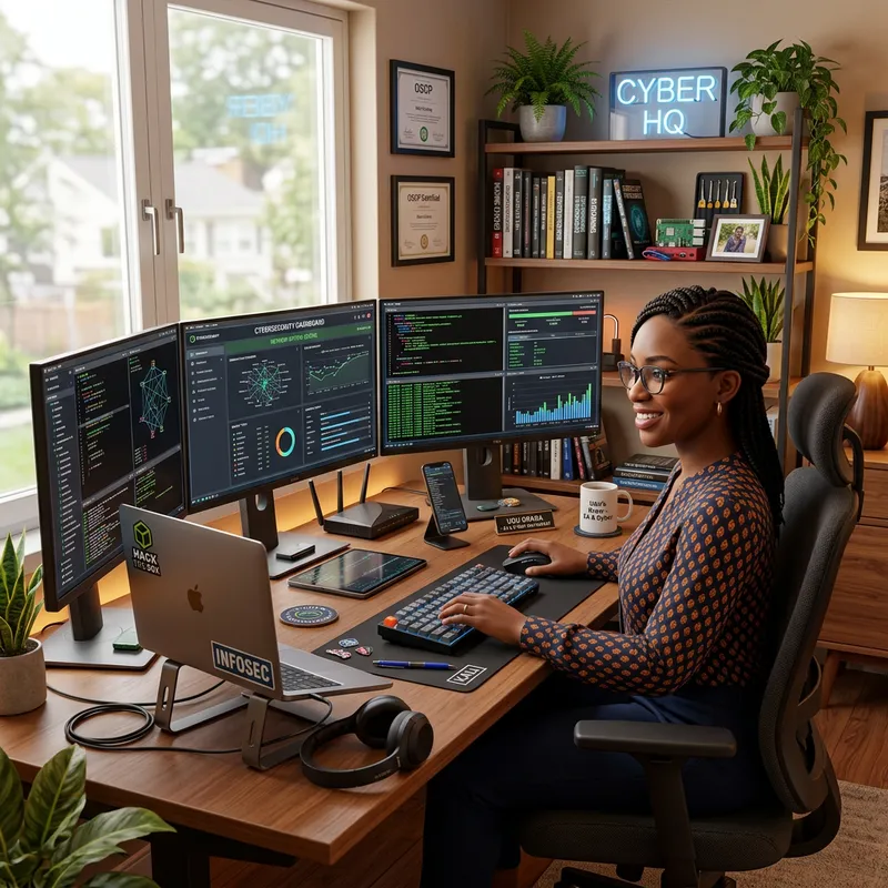 Generate a 3D image of Udu, a female executive assistant of African descent, who is passionate about cybersecurity. She can be seen working in a cozy, remote office setting filled with modern technological devices demonstrating her enthusiasm for cybersecurity.