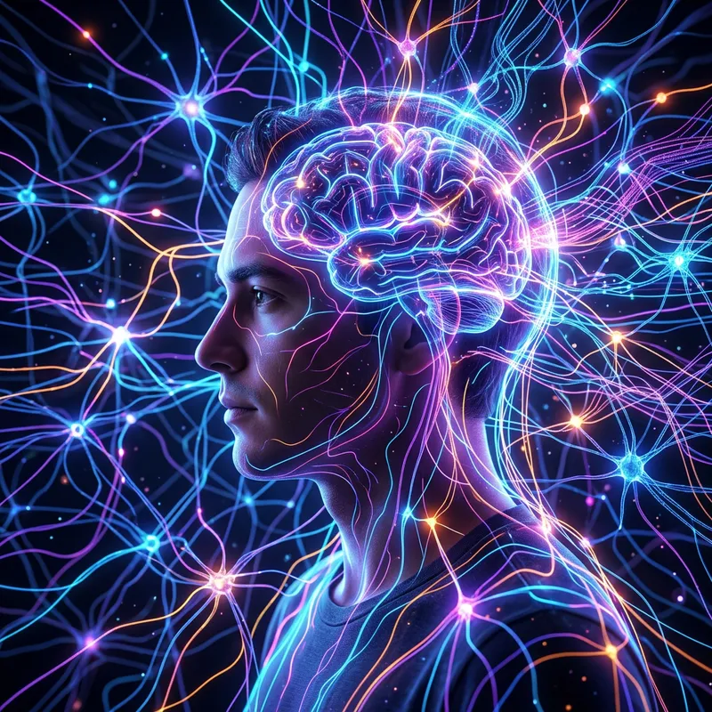 A 3D rendered profile view of a human being is enveloped by the radiant glow of neural networks. The surrounding neural networks are depicted as multitudes of interconnected neon lines, exhibiting detailed mapping. The image showcases a high level of detail and the color scheme primarily focuses on neon shades.