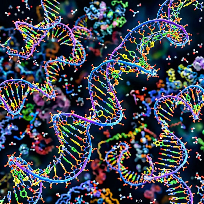 Generate a 3D image of a single-stranded DNA molecule, with visible nucleotide bases and a notable spiral structure, showcasing its inherent complexity.