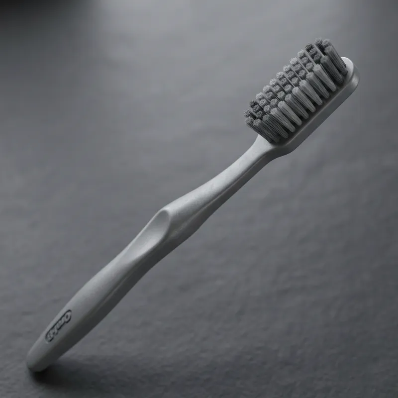 Visualize a three-dimensional model of a toothbrush. The design should be simple and practical, with a streamlined handle and a rectangular head, filled with neatly arranged bristles. All parts of this object, such as the handle, bristles, and the head, should be rendered in varying shades of gray, thus producing a monochrome aesthetic. The toothbrush should be positioned diagonally for a dynamic perspective. Try to add some texture to give a realistic touch to elements such as the bristles and handle. Enhance the 3D effect with careful shading and light effects.