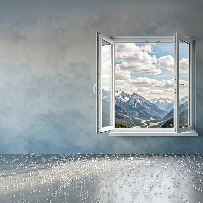 A 3D highly-detailed image, envisioning a clean white plastic window with its sides opened, positioned on the right side of a wide wall. The wall itself blends in a harmonious palette of soft, light-grey tones melting into subtle shades of blue. The vast emptiness of the space is partially filled by an ethereal view from the window, depicting fluffy clouds chaperoning majestic mountains. Observing more closely at the floor of the space, one can notice an intriguing layer of delicate bubbles sprinkled throughout.