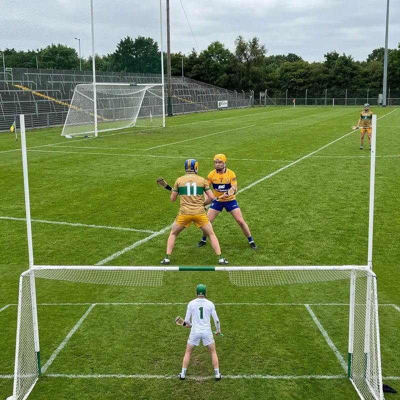 4 players on a GAA Pitch. Player 1 in goal wearing white wearing number 1 and holding a Hurley and wearing a helmet. Player 2 opposite end of pitch wearing gold jersey with a green sash standing in the right hand corner, 20 meters from end line, holding a Hurley and wearing a helmet. Player 3 wearing number 11, wearing a gold jersey with a green sash, standing 20 meters in front of Player 1, with his back to player 1, holding a Hurley and wearing a helmet. Player 4, wearing yellow and blue and wearing number 3, standing directly in front of player 3, facing player 3, one meter away from player 3, 21 meters in front of player 1, holding a Hurley and wearing a helmet.