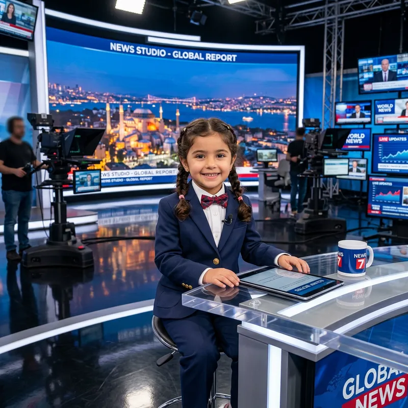 A 4-year-old Middle-Eastern girl wearing a formal attire in a news studio. She has an innocent smile and her outfit includes a small blazer, a shirt, and matching trousers. The news studio is filled with modern broadcasting equipment, bright lighting, and large monitors displaying global news. The floor is shiny, and the background is a gigantic screen showcasing a live cityscape.