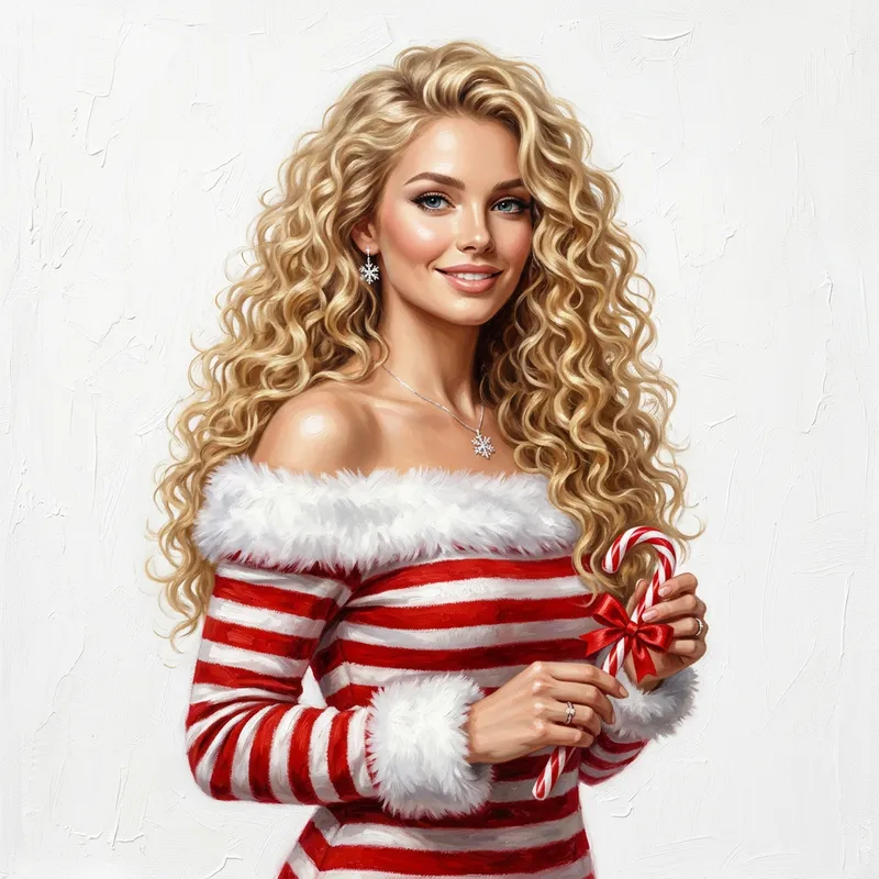 4k fantasy figurative art, be hance hd, a digital rendering of a stunning waist length blonde curly long-haired woman wearing a red and white striped Winter off the shoulder dress with fur and she's holding a candy cane, winter theme a soft light illuminates her sculpturesque face, enhancing her high cheekbones and elegant jaws, extremely detailed oil painting fixed on a white background