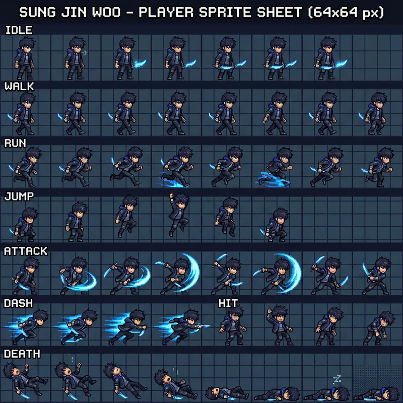 64x64 resolution pixel art game sprite sheet of a character based off of Sung Jin Woo with animation frames and character poses, pixel art or 2D game asset collection showing movement cycles, organized sprite layout for game development, retro gaming graphics perfect for indie games and platformers.