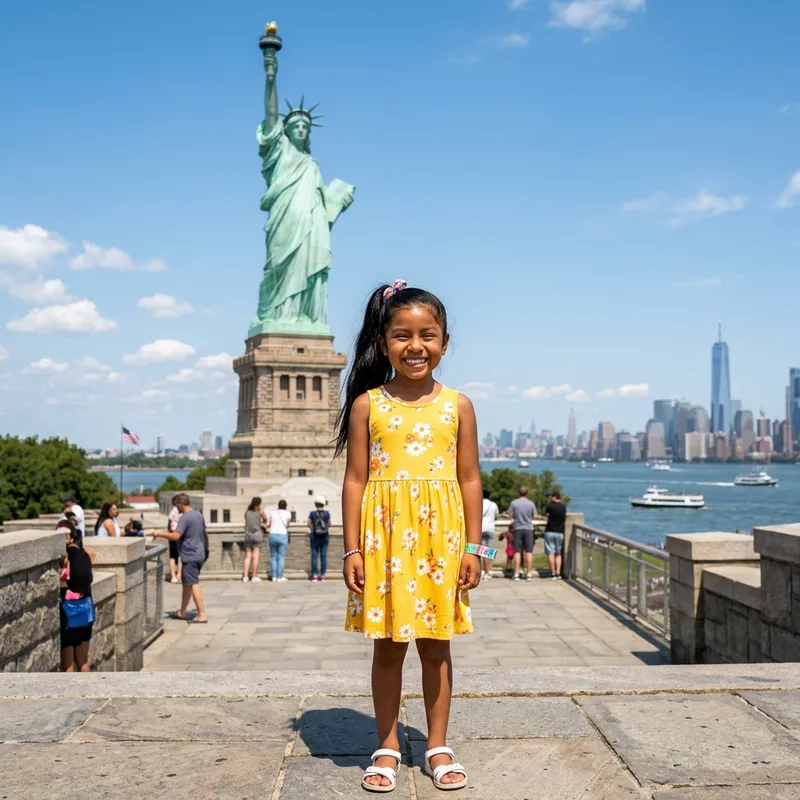 7-Year-Old Mexican Girl Smiling at Statue of Liberty
