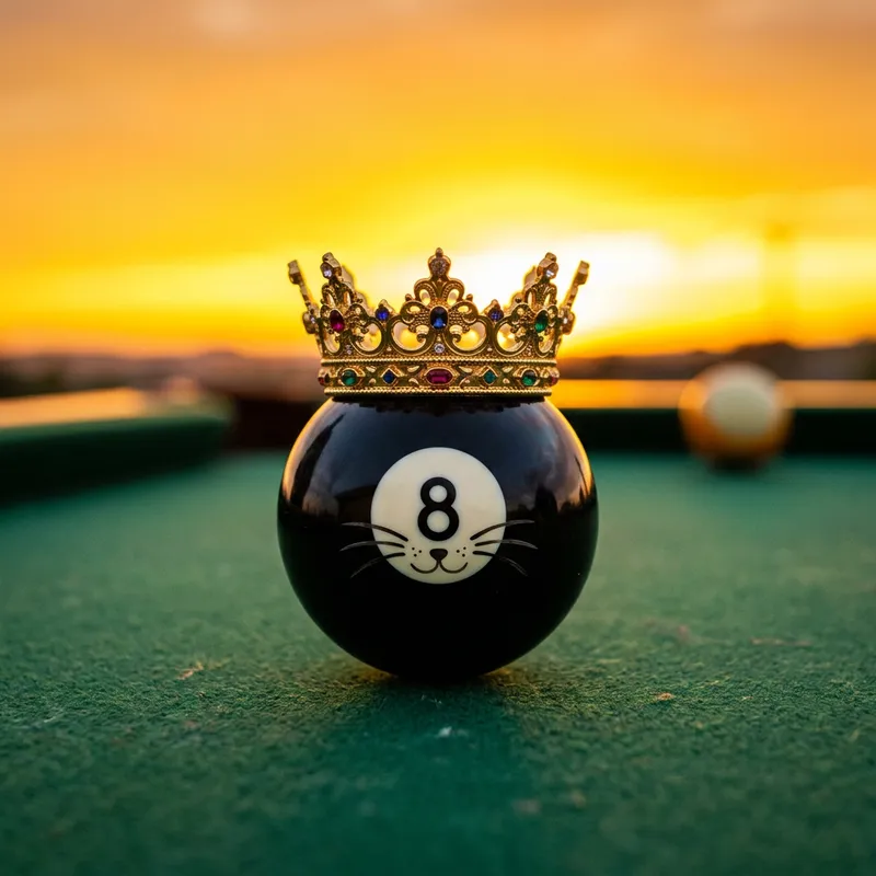A billiard ball, colored in deep black with the number eight imprinted on it, stands prominently. The ball is embellished with a golden crown resting on top, giving it a regal appearance. Delicately painted on the ball are cat whiskers, adding an element of whimsy to the design. Behind this intriguing ensemble, a vibrant yellow background contrasts dramatically with the black of the billiard ball, the scene reminiscent of a setting sun, serving to highlight and accentuate this unique amalgamation of elements.